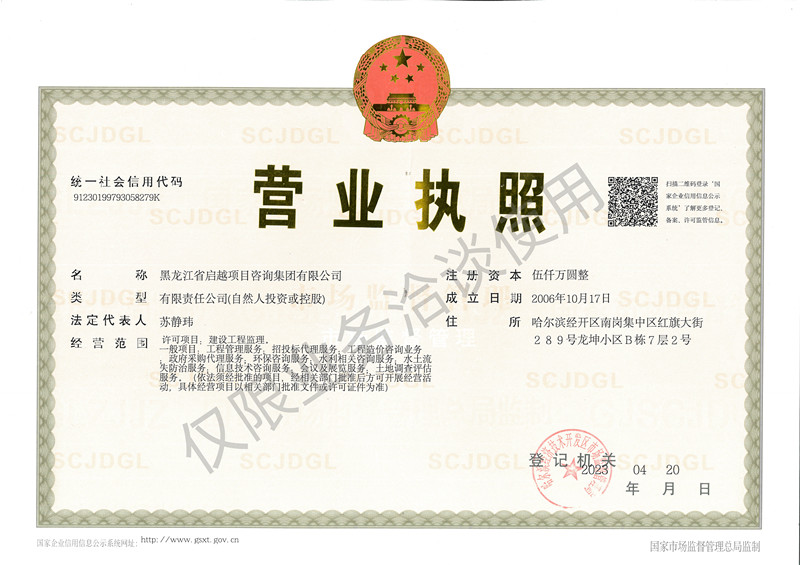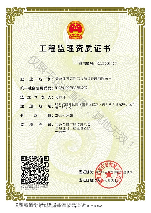 黑龍江省啟越項目咨詢集團有限公司,成立于2006年10月17日,具有中華人民共和國住房和城鄉(xiāng)建設部頒發(fā)的工程招標代理機構甲級資質、工程造價咨詢企業(yè)甲級資質;黑龍江省住房和城鄉(xiāng)建設廳頒發(fā)的房屋建筑工程監(jiān)理資質及市政公用工程監(jiān)理資質;黑龍江省司法廳頒布的司法鑒定許可證;中國政府采購網(wǎng)登記注冊的政府采購代理機構。我公司是專業(yè)從事工程類招標代理服務、政府采購項目類招標代理服務、工程造價咨詢服務、工程造價司法鑒定服務、工程監(jiān)理服務及建設項目全過程跟蹤管理的工程技術服務咨詢企業(yè)。